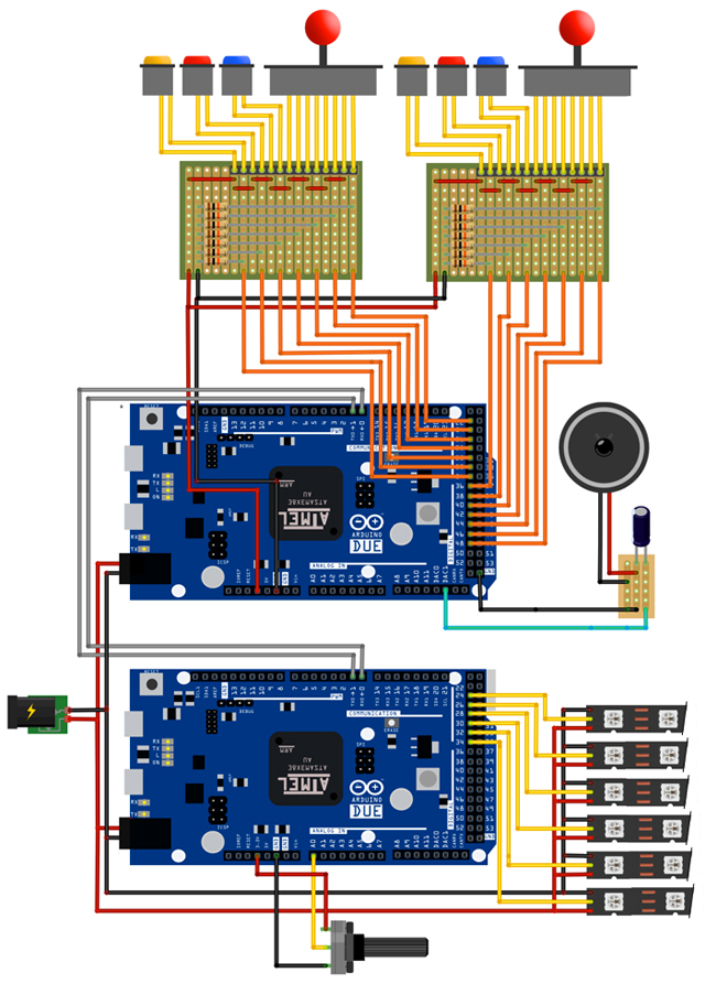 Prilično je pravolinijski: Povezanost dugmića i džojstika, konekcije za LED diode, mesto za osvetljenje ekrana i tx-rx linija između dva Arduina. Na vrhu se nalazi i DC veza za spiker koji je povezan na Arduino DAC.
